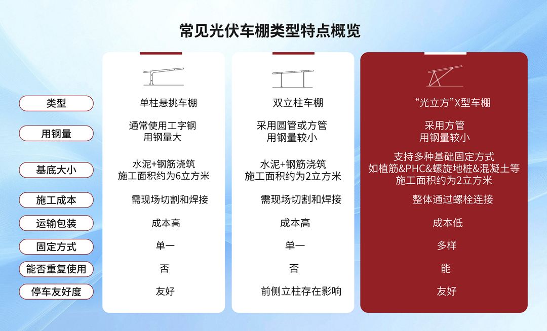 “光立方”车棚系统采用X形状的立柱设计有效减少立柱的弯矩,并很好地卸载了来自斜梁的力。因结构更合理、承载力也够,水泥基础可以做到更小,基础材料减少60%以上,人工成本降低40%以上。